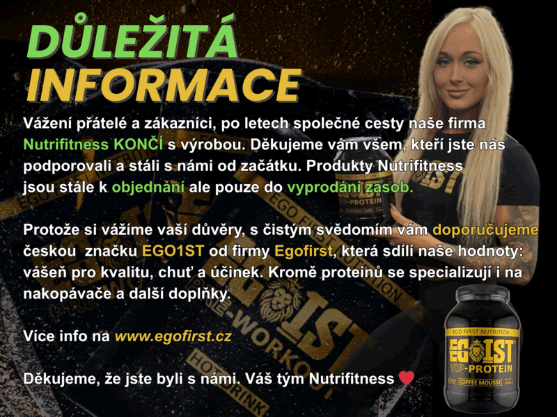 Jsme český výrobce sportovní výživy a doplňků stravy, kde máme při VÝVOJI a VÝROBĚ prioritu: „používání ověřených surovin přírodního původu v nejvyšší kvalitě“. Náš SORTIMENT máme rozdělen do kategorií FITNESS&BODYBUILDING, VYTRVALOSTNÍ SPORTY, WELLNESS, FIT LINIE a MLADÍ SPORTOVCI.